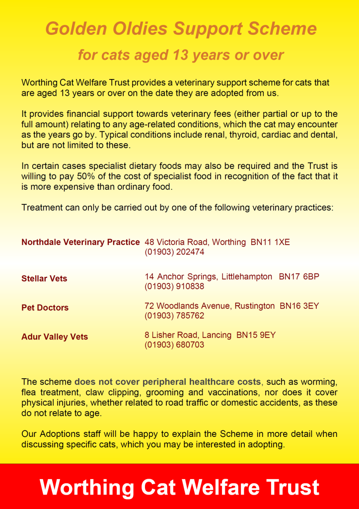 The scheme pledges ongoing financial support from Worthing Cat Welfare Trust in terms of age-related veterinary costs may become substantial as the cat gets older.